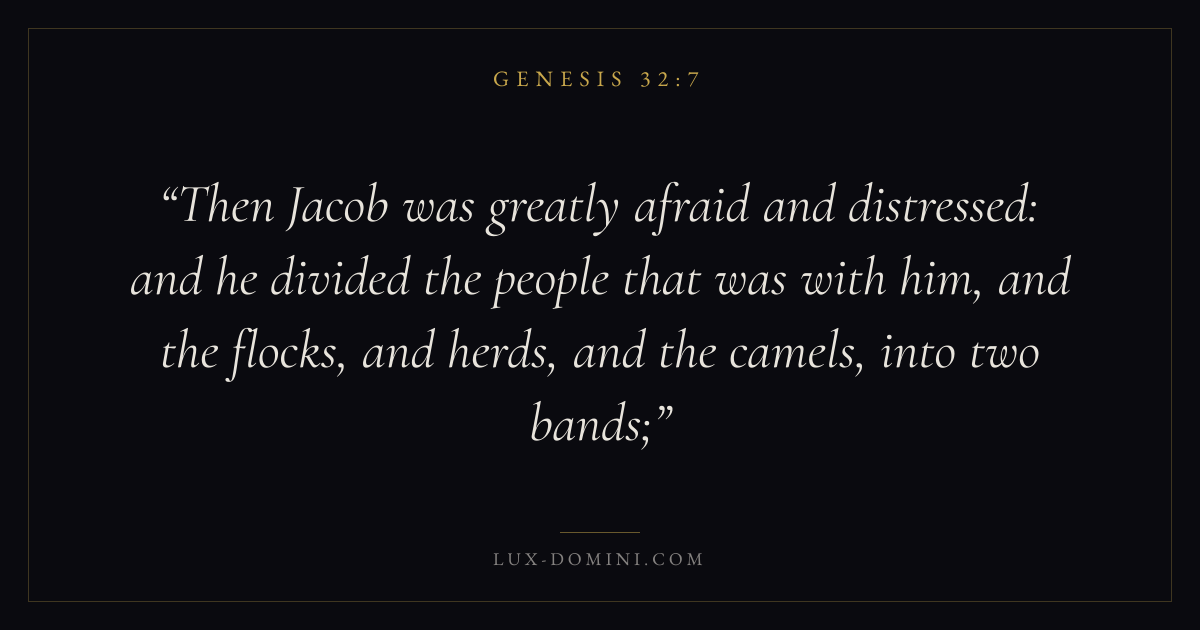 Then Jacob was greatly afraid and distressed: and he divided the people that was with him, and the flocks, and herds, and the camels, into two bands;