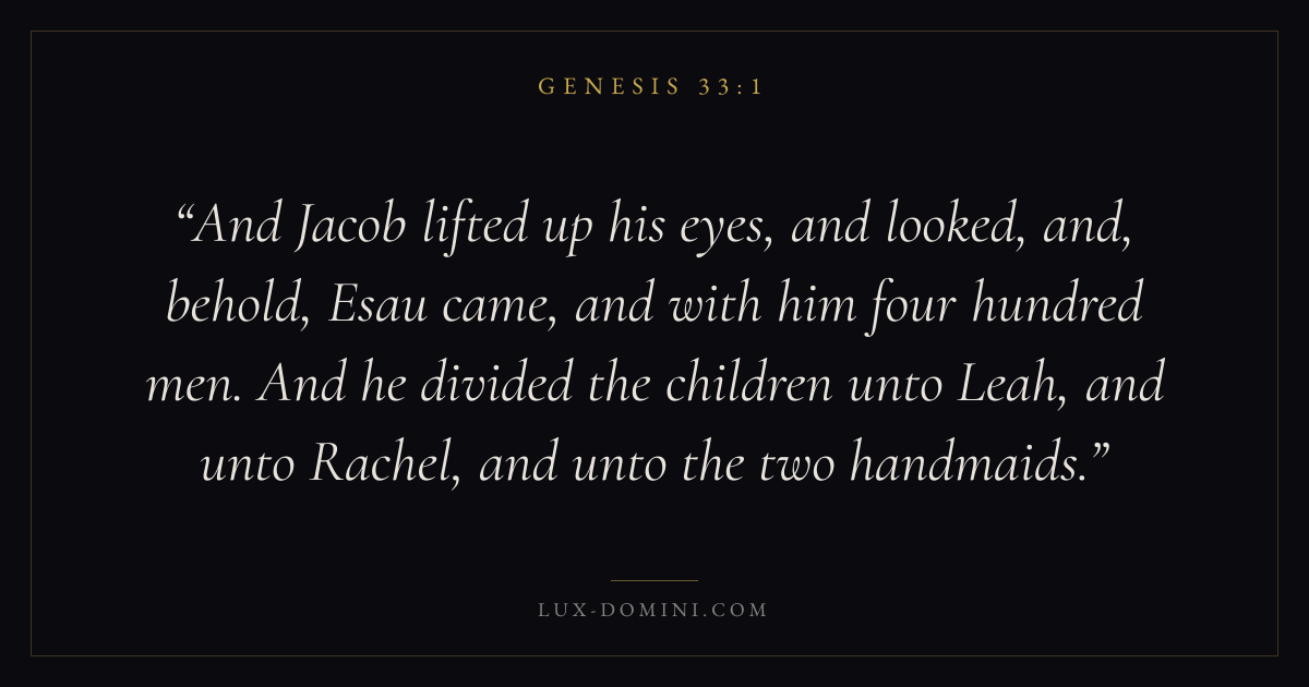 And Jacob lifted up his eyes, and looked, and, behold, Esau came, and with him four hundred men. And he divided the children unto Leah, and unto Rachel, and unto the two handmaids.