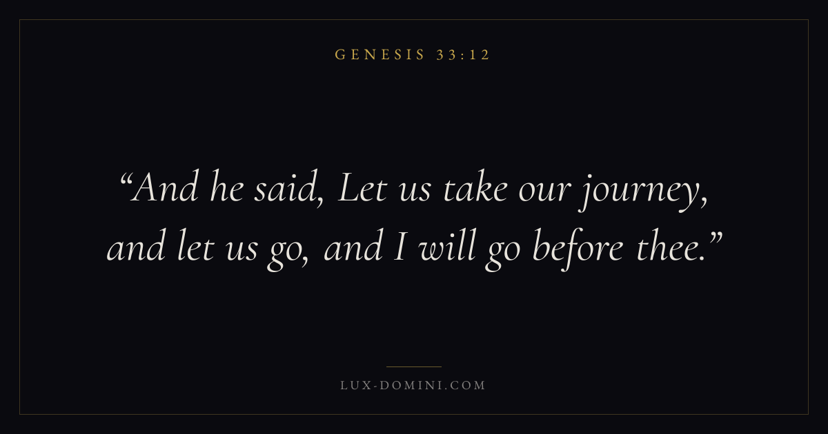 Books / Genesis / Chapter 33 / Verse 12 ← Genesis 33:11 Genesis 33:12 Genesis 33:13 → And he said, Let us take our journey, and let us go, and I will go before thee. Download verse card Share on Twitter Share on Facebook Pin it ✦ Key themes HopePrayerCreationFall Read with Genesis 33:10Genesis 33:11Romans 8:24Revelation 21:4 Related topics Bible verses about hopeBible verses about prayer ✦ Genesis Chapter 33 verses V. 1 V. 2 V. 3 V. 4 V. 5 V. 6 V. 7 V. 8 V. 9 V. 10 V. 11 V. 12 V. 13 V. 14 V. 15 V. 16 V. 17 V. 18 V. 19 V. 20