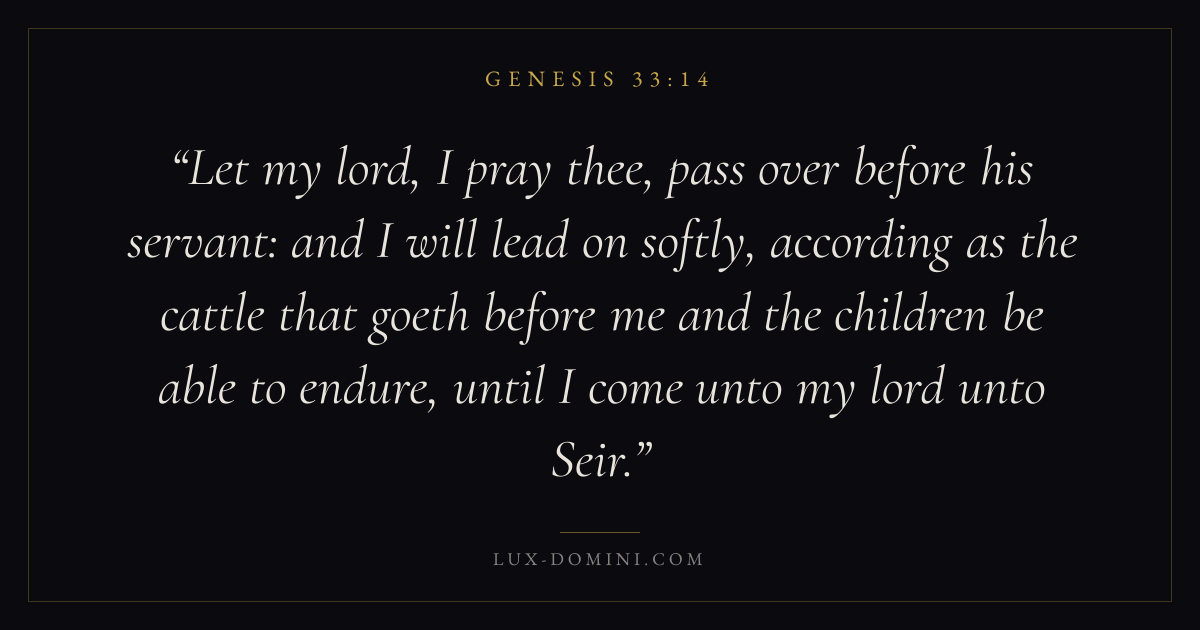 Let my lord, I pray thee, pass over before his servant: and I will lead on softly, according as the cattle that goeth before me and the children be able to endure, until I come unto my lord unto Seir.