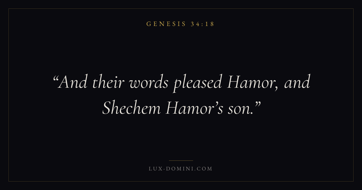 Books / Genesis / Chapter 34 / Verse 18 ← Genesis 34:17 Genesis 34:18 Genesis 34:19 → And their words pleased Hamor, and Shechem Hamor’s son. Download verse card Share on Twitter Share on Facebook Pin it ✦ Key themes HopeCreationFallCovenant Read with Genesis 34:19Romans 8:24Revelation 21:4 Related topics Bible verses about hope ✦ Genesis Chapter 34 verses V. 1 V. 2 V. 3 V. 4 V. 5 V. 6 V. 7 V. 8 V. 9 V. 10 V. 11 V. 12 V. 13 V. 14 V. 15 V. 16 V. 17 V. 18 V. 19 V. 20 V. 21 V. 22 V. 23 V. 24 V. 25 V. 26 V. 27 V. 28 V. 29 V. 30 V. 31