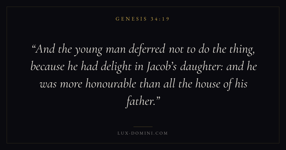 And the young man deferred not to do the thing, because he had delight in Jacob’s daughter: and he was more honourable than all the house of his father.