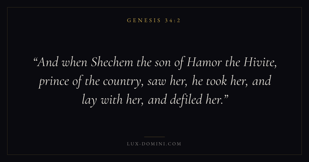 And when Shechem the son of Hamor the Hivite, prince of the country, saw her, he took her, and lay with her, and defiled her.