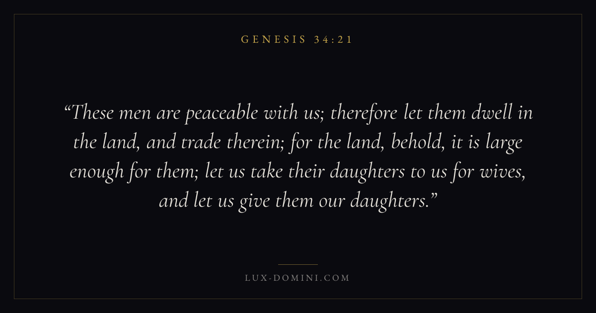 These men are peaceable with us; therefore let them dwell in the land, and trade therein; for the land, behold, it is large enough for them; let us take their daughters to us for wives, and let us give them our daughters.