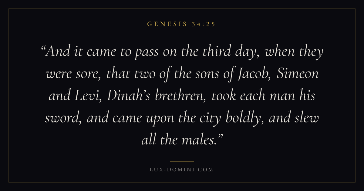 And it came to pass on the third day, when they were sore, that two of the sons of Jacob, Simeon and Levi, Dinah’s brethren, took each man his sword, and came upon the city boldly, and slew all the males.