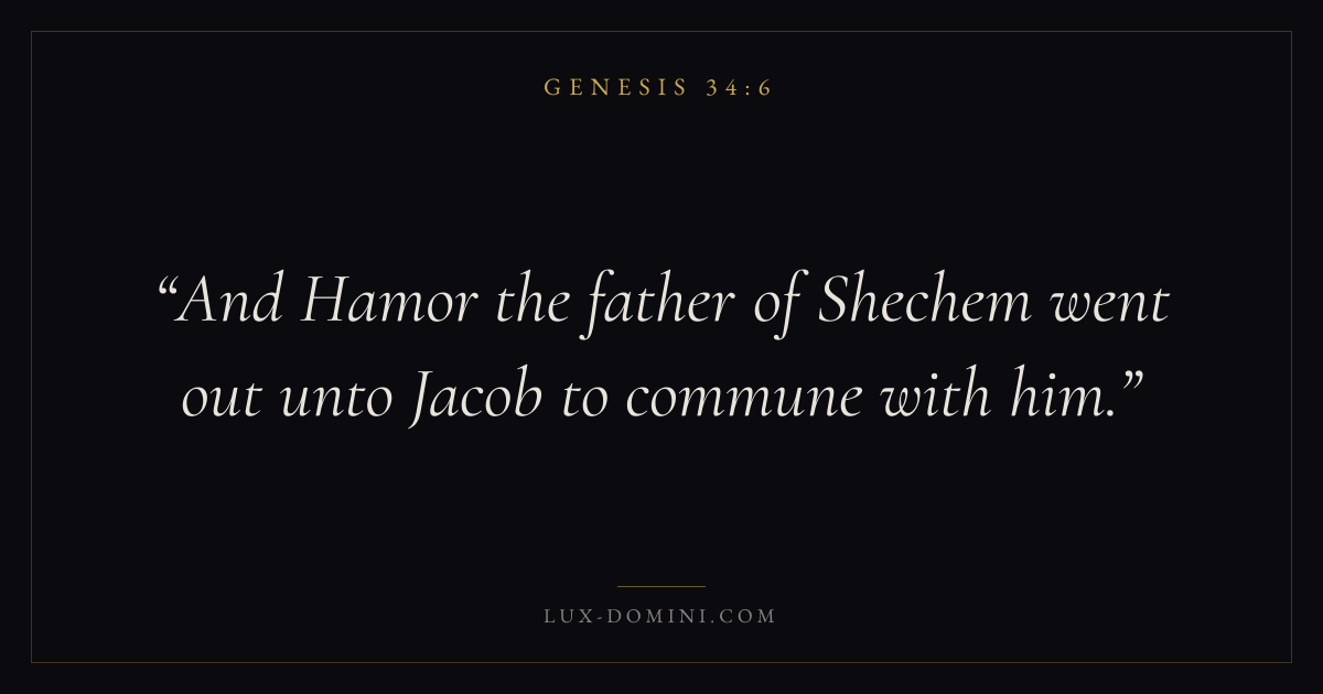 Books / Genesis / Chapter 34 / Verse 6 ← Genesis 34:5 Genesis 34:6 Genesis 34:7 → And Hamor the father of Shechem went out unto Jacob to commune with him. Download verse card Share on Twitter Share on Facebook Pin it ✦ Key themes HopeCreationFallCovenant Read with Genesis 34:7Genesis 34:8Romans 8:24Revelation 21:4 Related topics Bible verses about hope ✦ Genesis Chapter 34 verses V. 1 V. 2 V. 3 V. 4 V. 5 V. 6 V. 7 V. 8 V. 9 V. 10 V. 11 V. 12 V. 13 V. 14 V. 15 V. 16 V. 17 V. 18 V. 19 V. 20 V. 21 V. 22 V. 23 V. 24 V. 25 V. 26 V. 27 V. 28 V. 29 V. 30 V. 31