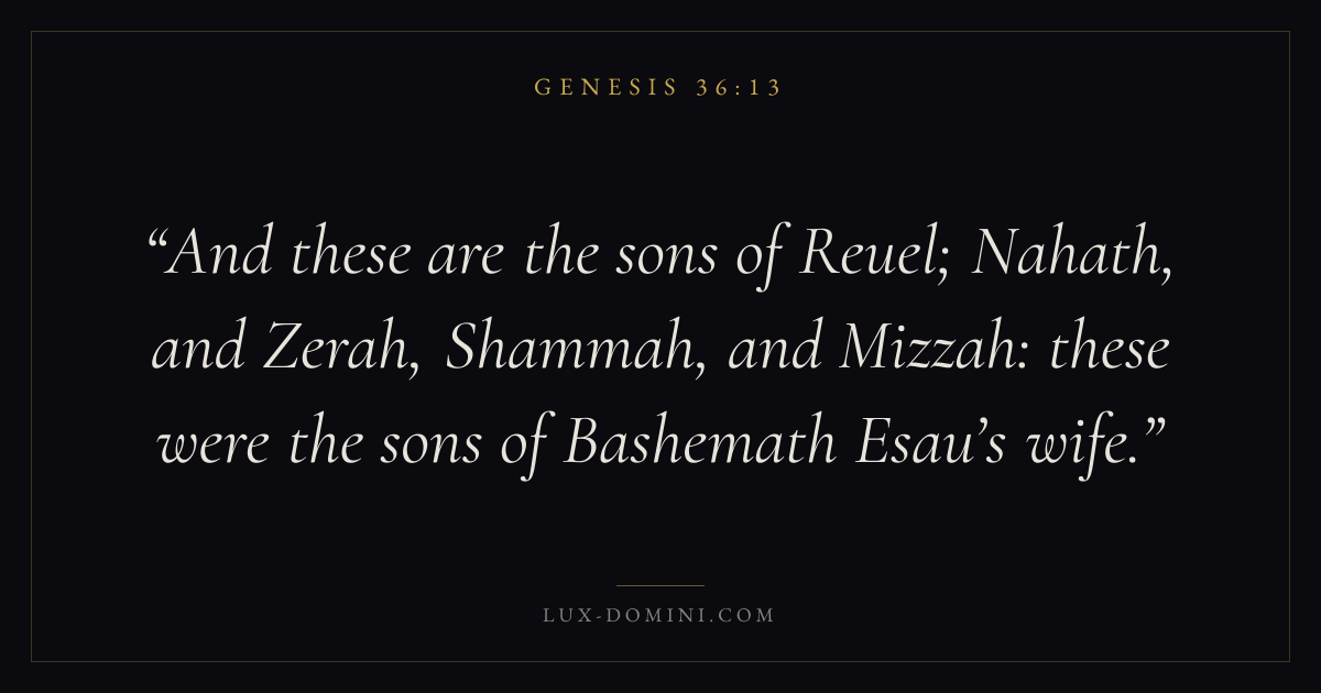 And these are the sons of Reuel; Nahath, and Zerah, Shammah, and Mizzah: these were the sons of Bashemath Esau’s wife.