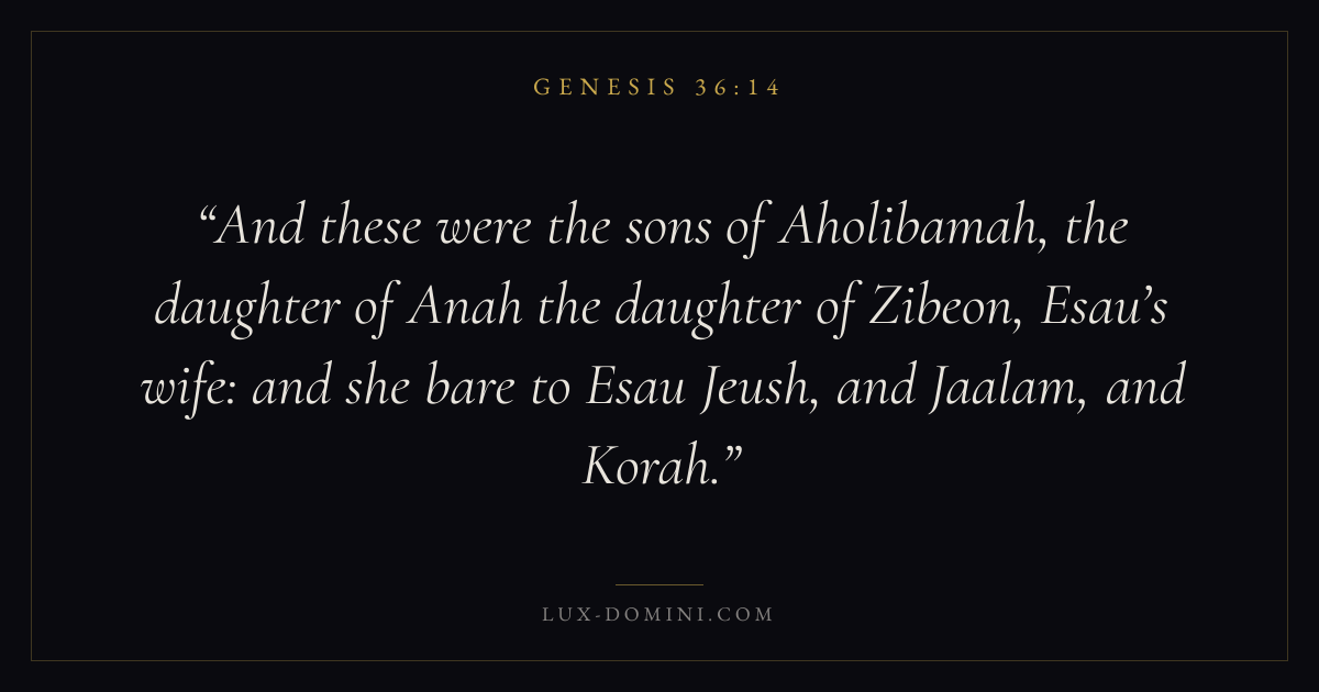 And these were the sons of Aholibamah, the daughter of Anah the daughter of Zibeon, Esau’s wife: and she bare to Esau Jeush, and Jaalam, and Korah.