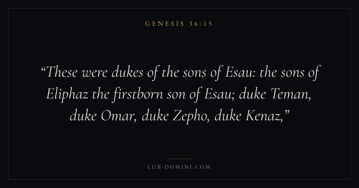 These were dukes of the sons of Esau: the sons of Eliphaz the firstborn son of Esau; duke Teman, duke Omar, duke Zepho, duke Kenaz,