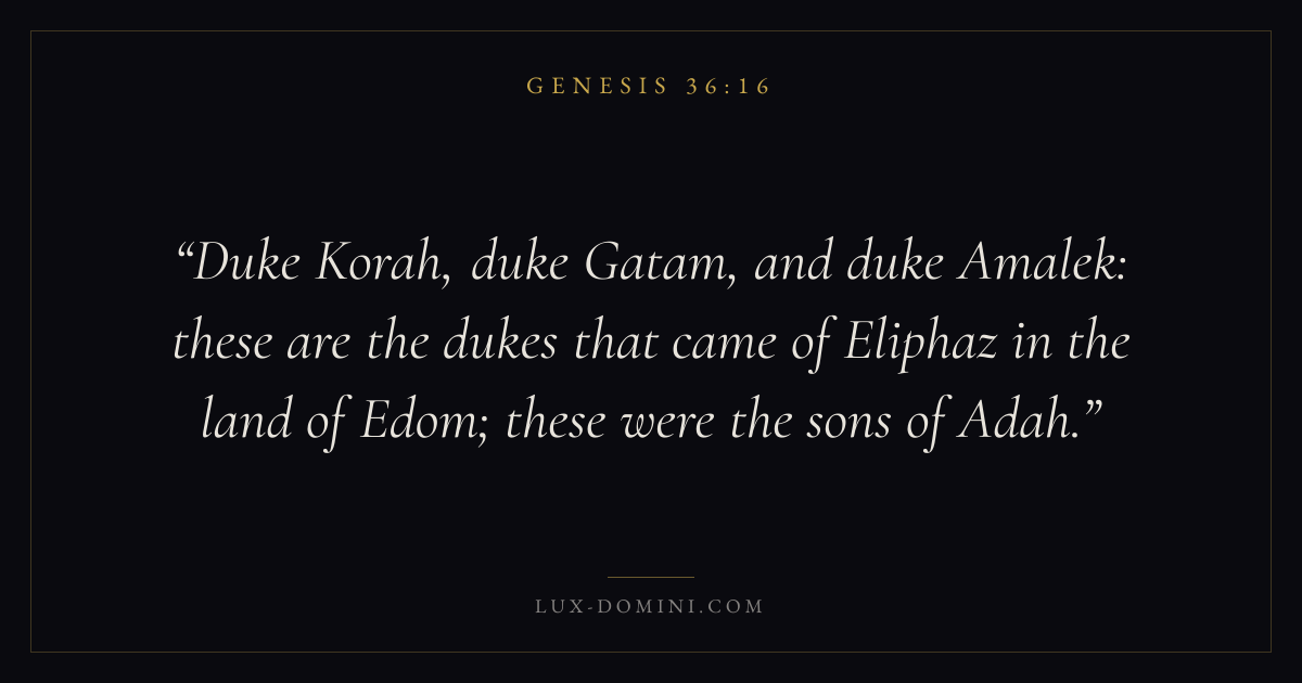 Duke Korah, duke Gatam, and duke Amalek: these are the dukes that came of Eliphaz in the land of Edom; these were the sons of Adah.