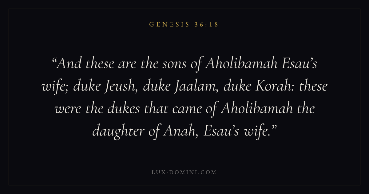 And these are the sons of Aholibamah Esau’s wife; duke Jeush, duke Jaalam, duke Korah: these were the dukes that came of Aholibamah the daughter of Anah, Esau’s wife.