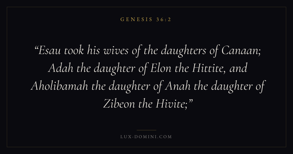 Esau took his wives of the daughters of Canaan; Adah the daughter of Elon the Hittite, and Aholibamah the daughter of Anah the daughter of Zibeon the Hivite;