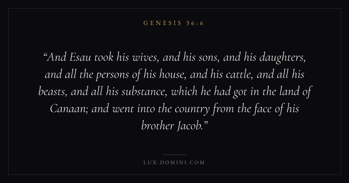 And Esau took his wives, and his sons, and his daughters, and all the persons of his house, and his cattle, and all his beasts, and all his substance, which he had got in the land of Canaan; and went into the country from the face of his brother Jacob.
