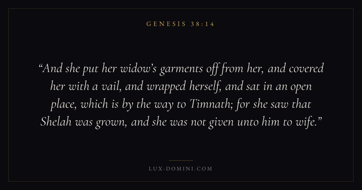 And she put her widow’s garments off from her, and covered her with a vail, and wrapped herself, and sat in an open place, which is by the way to Timnath; for she saw that Shelah was grown, and she was not given unto him to wife.