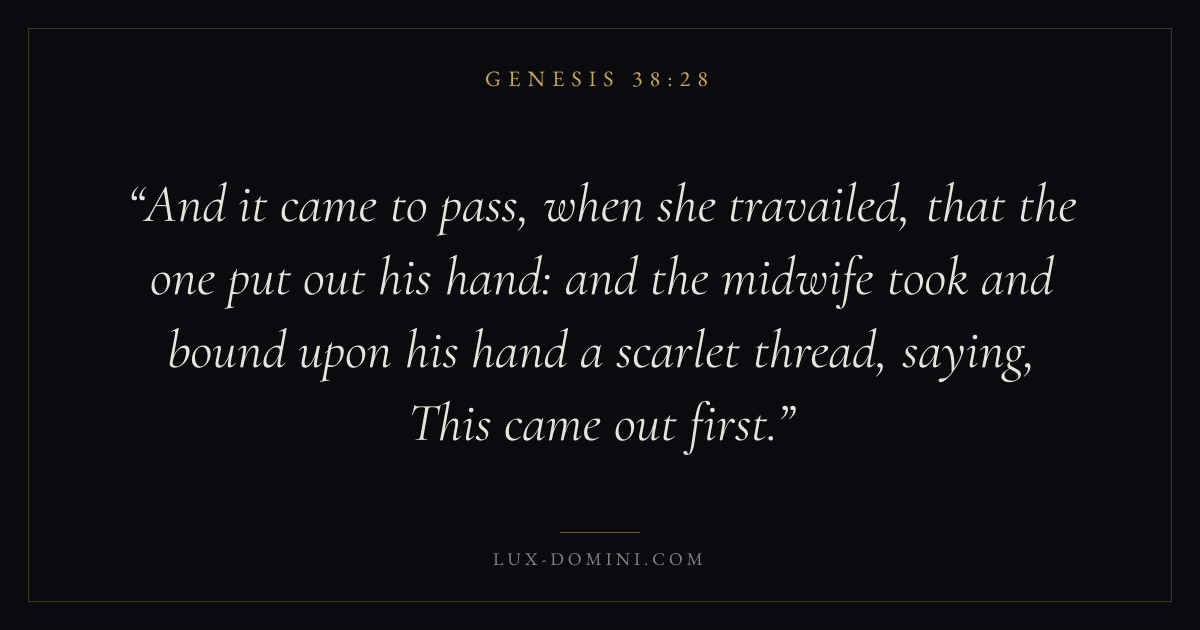 And it came to pass, when she travailed, that the one put out his hand: and the midwife took and bound upon his hand a scarlet thread, saying, This came out first.
