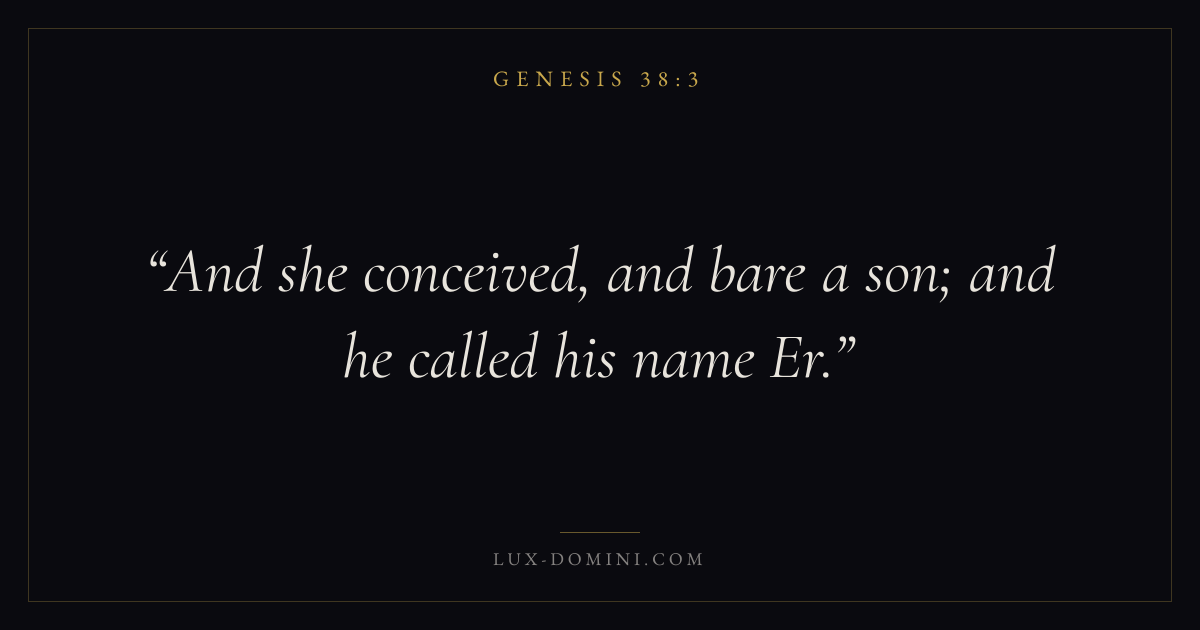 Books / Genesis / Chapter 38 / Verse 3 ← Genesis 38:2 Genesis 38:3 Genesis 38:4 → And she conceived, and bare a son; and he called his name Er. Download verse card Share on Twitter Share on Facebook Pin it ✦ Key themes HopeCreationFallCovenant Read with Genesis 38:1Genesis 38:2Romans 8:24Revelation 21:4 Related topics Bible verses about hope ✦ Genesis Chapter 38 verses V. 1 V. 2 V. 3 V. 4 V. 5 V. 6 V. 7 V. 8 V. 9 V. 10 V. 11 V. 12 V. 13 V. 14 V. 15 V. 16 V. 17 V. 18 V. 19 V. 20 V. 21 V. 22 V. 23 V. 24 V. 25 V. 26 V. 27 V. 28 V. 29 V. 30