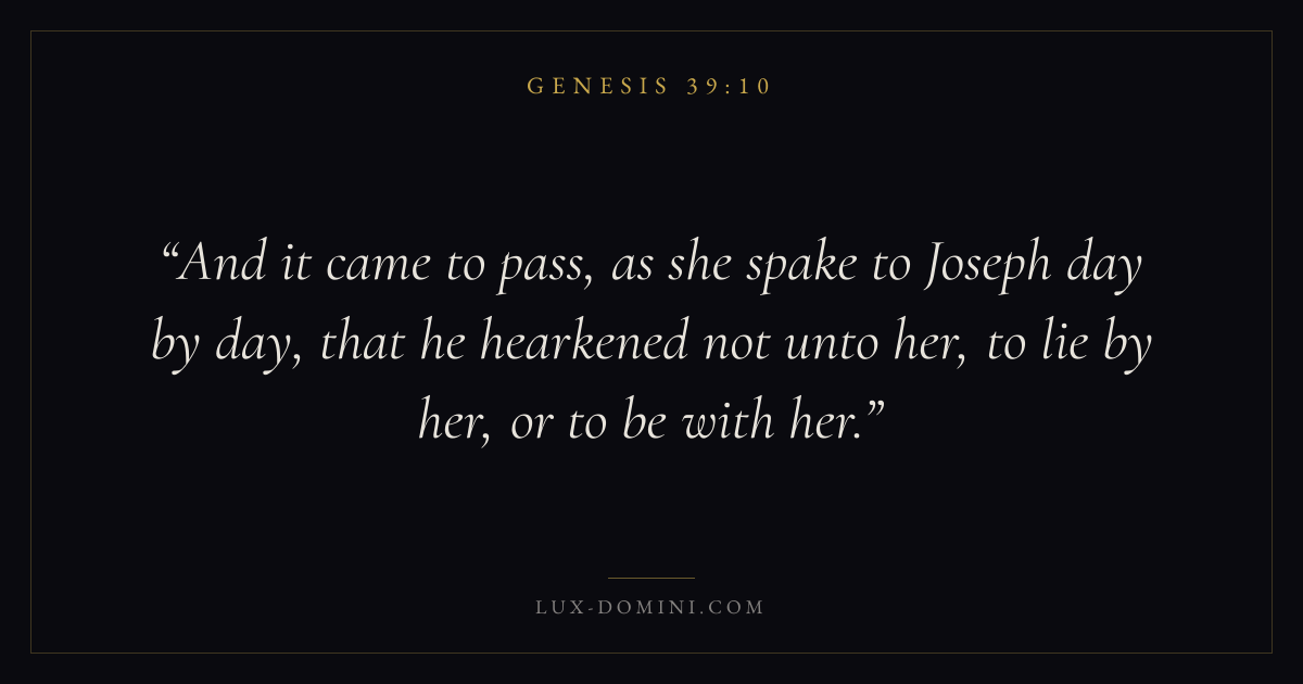 And it came to pass, as she spake to Joseph day by day, that he hearkened not unto her, to lie by her, or to be with her.