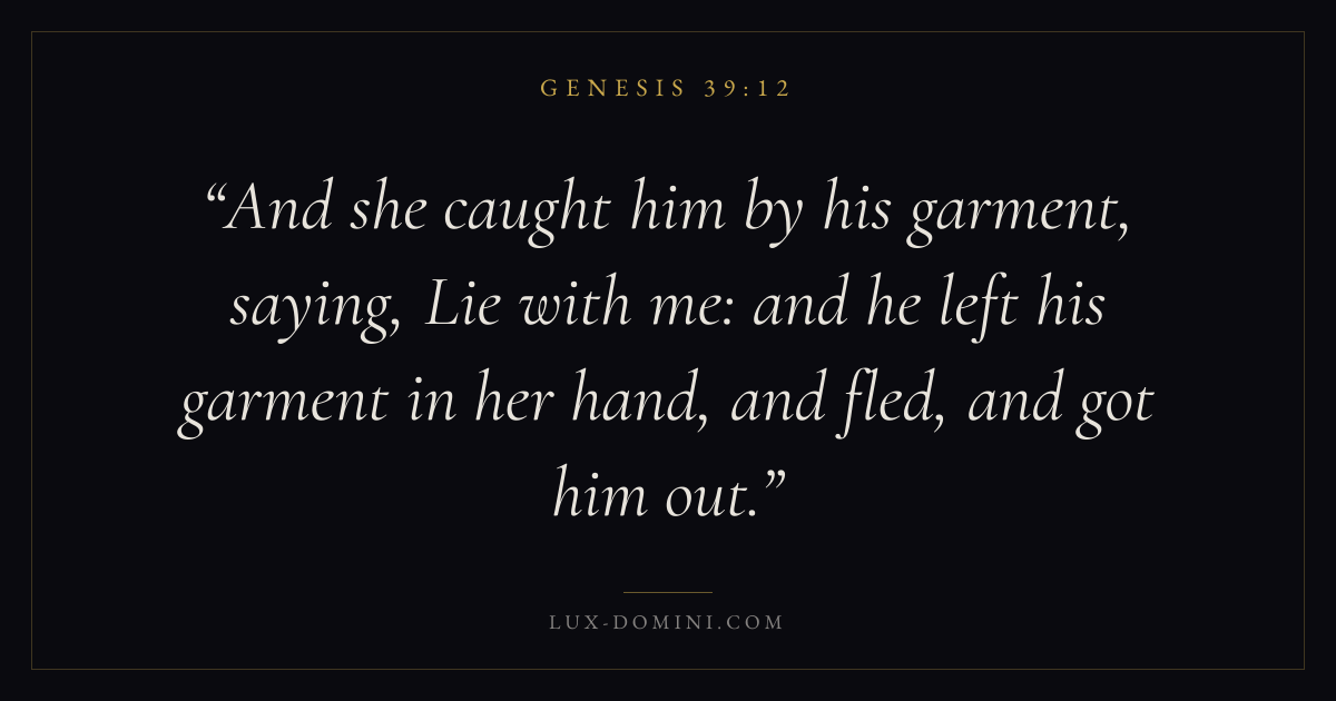 And she caught him by his garment, saying, Lie with me: and he left his garment in her hand, and fled, and got him out.