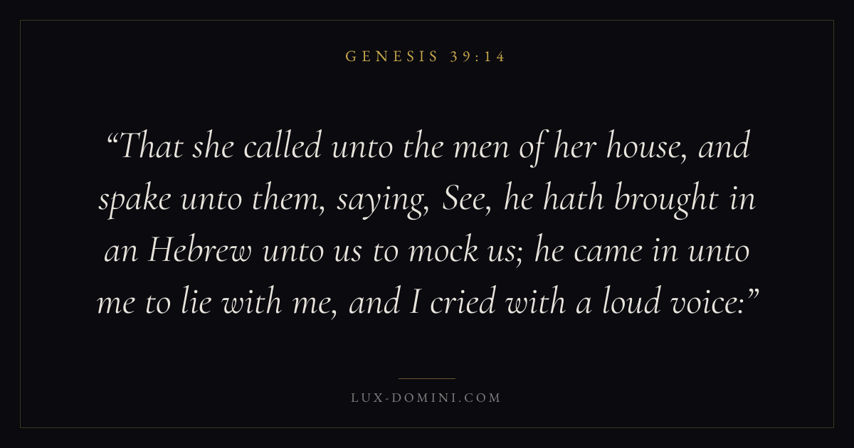 That she called unto the men of her house, and spake unto them, saying, See, he hath brought in an Hebrew unto us to mock us; he came in unto me to lie with me, and I cried with a loud voice: