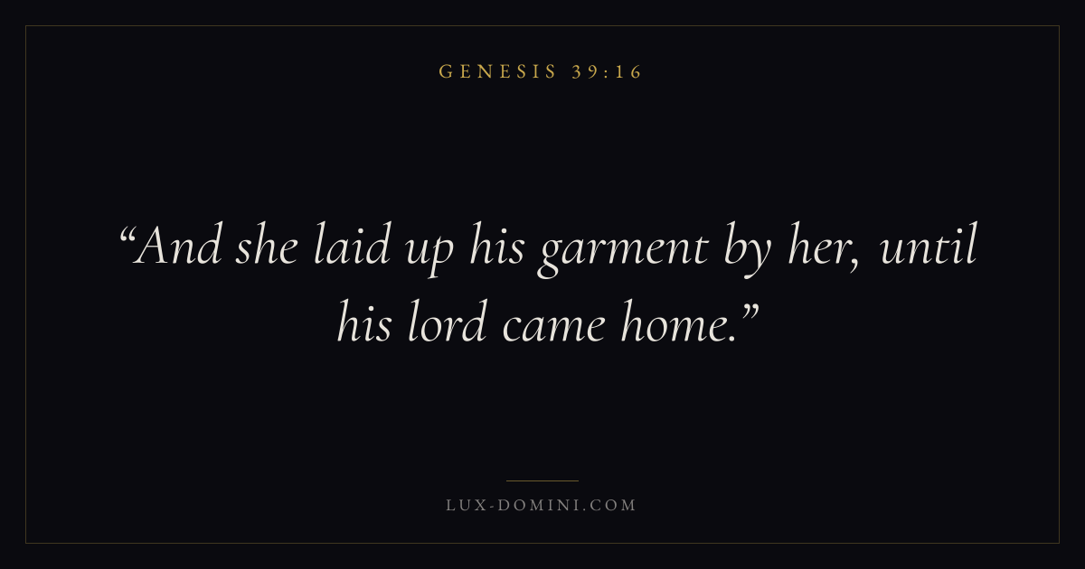 And she laid up his garment by her,.... As a proof of what she laid to his charge, and as a testimony against him: until her lord came home; or until his lord came home, for the pronoun refers to Joseph, and so Jarchi interprets it; who either was gone a journey, or gone to court that day, being an officer of Pharaoh's, or to the public place where the festival was kept that day, if it was such an one.