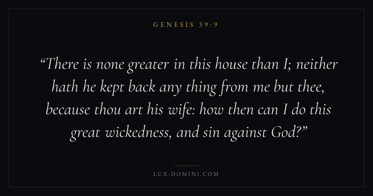 There is none greater in this house than I; neither hath he kept back any thing from me but thee, because thou art his wife: how then can I do this great wickedness, and sin against God?