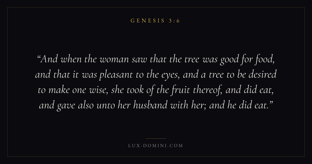 And when the woman saw that the tree was good for food, and that it was pleasant to the eyes, and a tree to be desired to make one wise, she took of the fruit thereof, and did eat, and gave also unto her husband with her; and he did eat.
