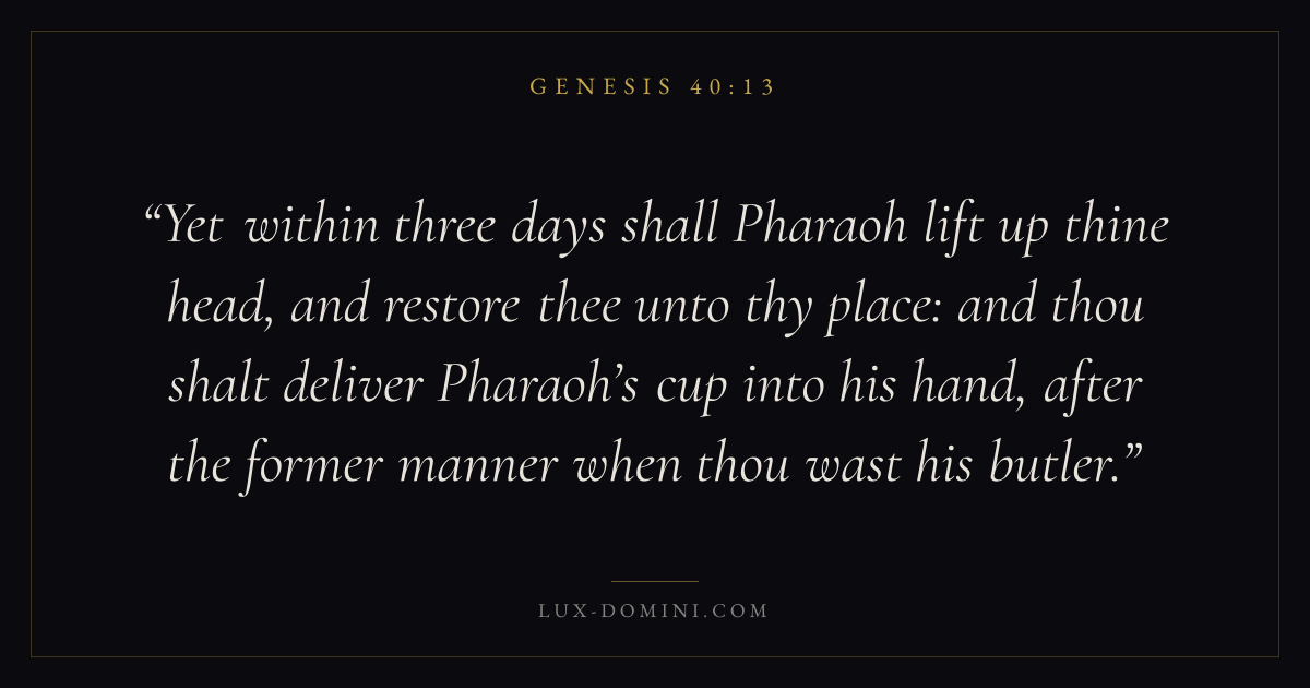 Yet within three days shall Pharaoh lift up thine head, and restore thee unto thy place: and thou shalt deliver Pharaoh’s cup into his hand, after the former manner when thou wast his butler.