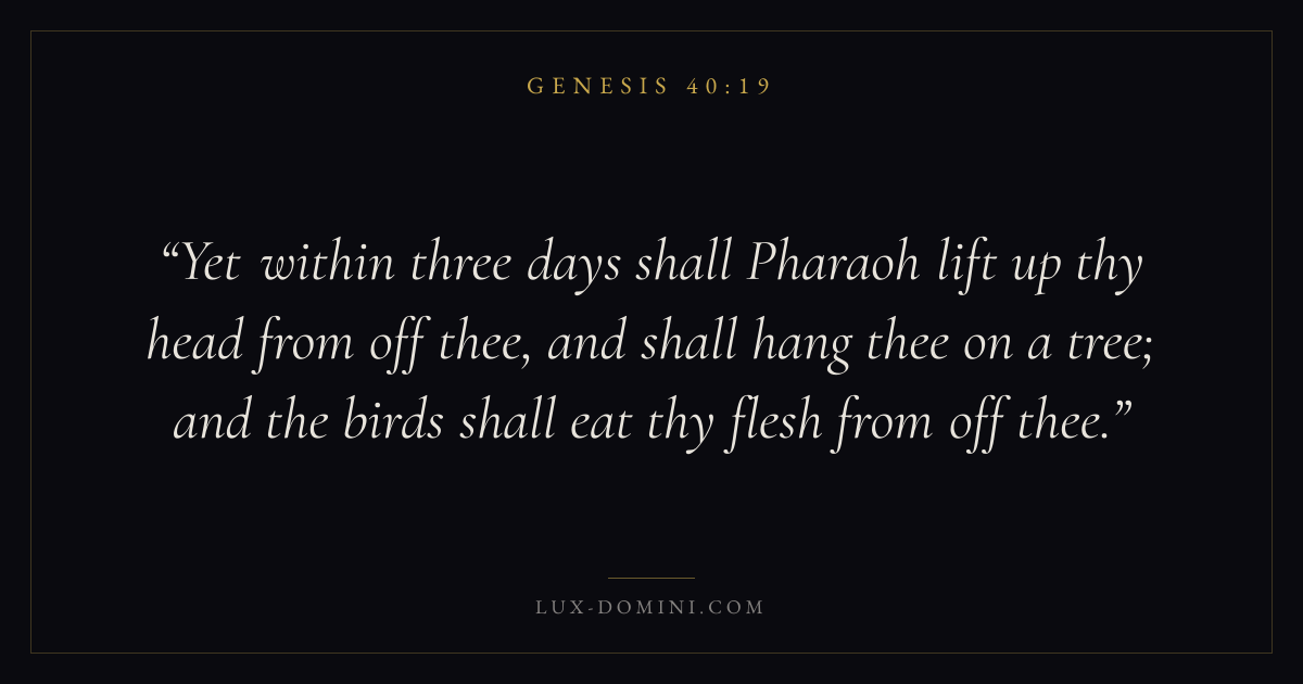 Yet within three days shall Pharaoh lift up thy head from off thee, and shall hang thee on a tree; and the birds shall eat thy flesh from off thee.