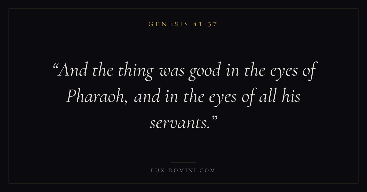 Books / Genesis / Chapter 41 / Verse 37 ← Genesis 41:36 Genesis 41:37 Genesis 41:38 → And the thing was good in the eyes of Pharaoh, and in the eyes of all his servants. Download verse card Share on Twitter Share on Facebook Pin it ✦ Key themes HopeCreationFallCovenant Read with Genesis 41:38Genesis 41:39Romans 8:24Revelation 21:4 Related topics Bible verses about hope ✦ Genesis Chapter 41 verses V. 1 V. 2 V. 3 V. 4 V. 5 V. 6 V. 7 V. 8 V. 9 V. 10 V. 11 V. 12 V. 13 V. 14 V. 15 V. 16 V. 17 V. 18 V. 19 V. 20 V. 21 V. 22 V. 23 V. 24 V. 25 V. 26 V. 27 V. 28 V. 29 V. 30 V. 31 V. 32 V. 33 V. 34 V. 35 V. 36 V. 37 V. 38 V. 39 V. 40 V. 41 V. 42 V. 43 V. 44 V. 45 V. 46 V. 47 V. 48 V. 49 V. 50 V. 51 V. 52 V. 53 V. 54 V. 55 V. 56 V. 57