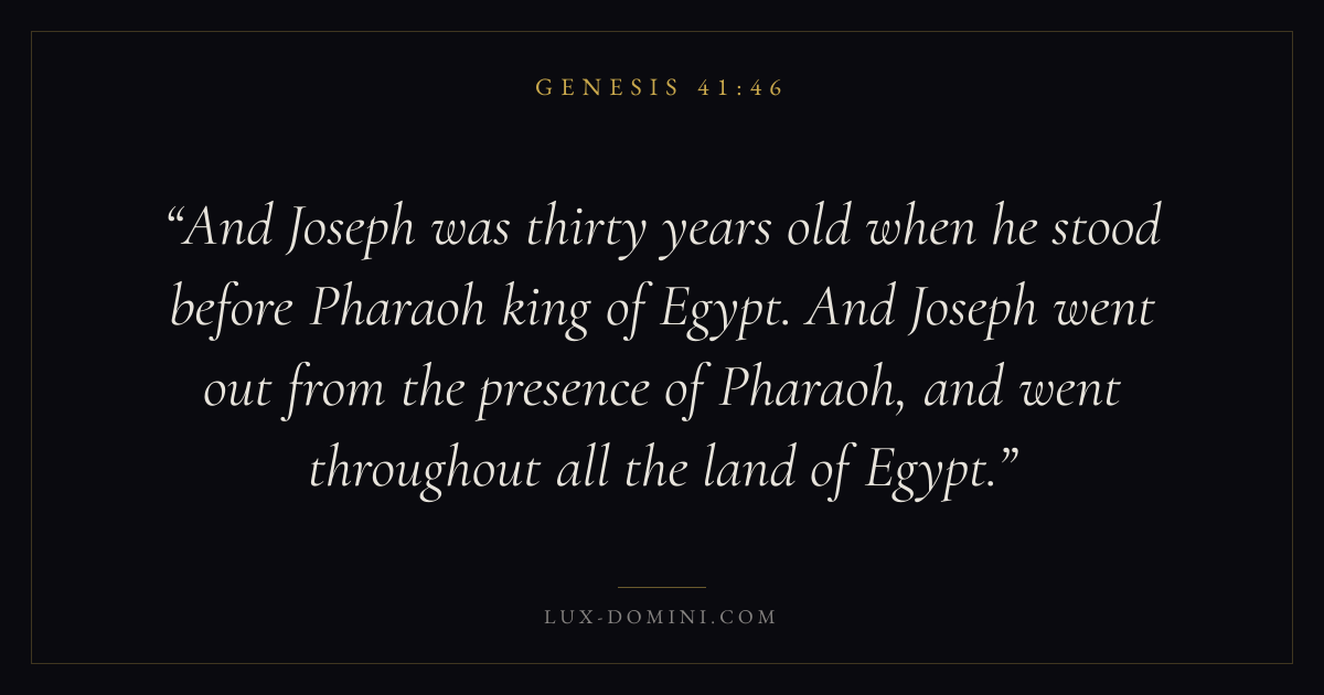 And Joseph was thirty years old when he stood before Pharaoh king of Egypt. And Joseph went out from the presence of Pharaoh, and went throughout all the land of Egypt.