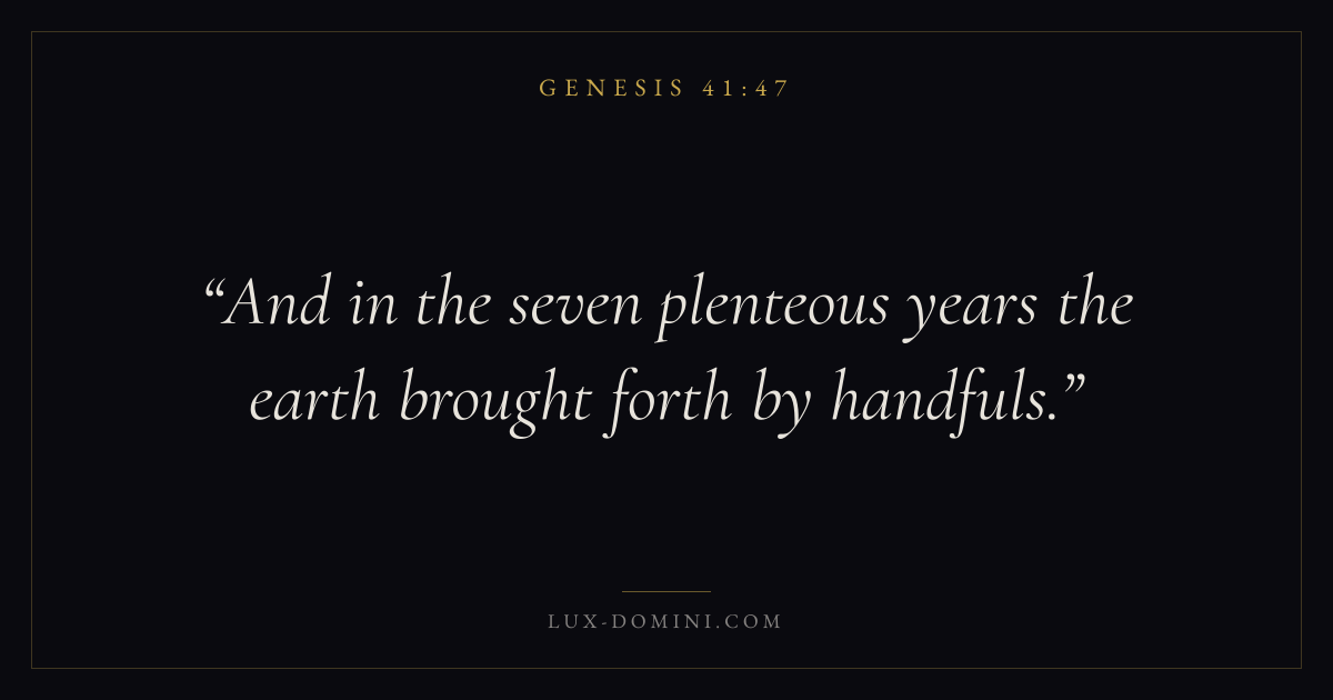 Books / Genesis / Chapter 41 / Verse 47 ← Genesis 41:46 Genesis 41:47 Genesis 41:48 → And in the seven plenteous years the earth brought forth by handfuls. Download verse card Share on Twitter Share on Facebook Pin it ✦ Key themes HopeCreationFallCovenant Read with Genesis 41:46Genesis 41:48Romans 8:24Revelation 21:4 Related topics Bible verses about hope ✦ Genesis Chapter 41 verses V. 1 V. 2 V. 3 V. 4 V. 5 V. 6 V. 7 V. 8 V. 9 V. 10 V. 11 V. 12 V. 13 V. 14 V. 15 V. 16 V. 17 V. 18 V. 19 V. 20 V. 21 V. 22 V. 23 V. 24 V. 25 V. 26 V. 27 V. 28 V. 29 V. 30 V. 31 V. 32 V. 33 V. 34 V. 35 V. 36 V. 37 V. 38 V. 39 V. 40 V. 41 V. 42 V. 43 V. 44 V. 45 V. 46 V. 47 V. 48 V. 49 V. 50 V. 51 V. 52 V. 53 V. 54 V. 55 V. 56 V. 57