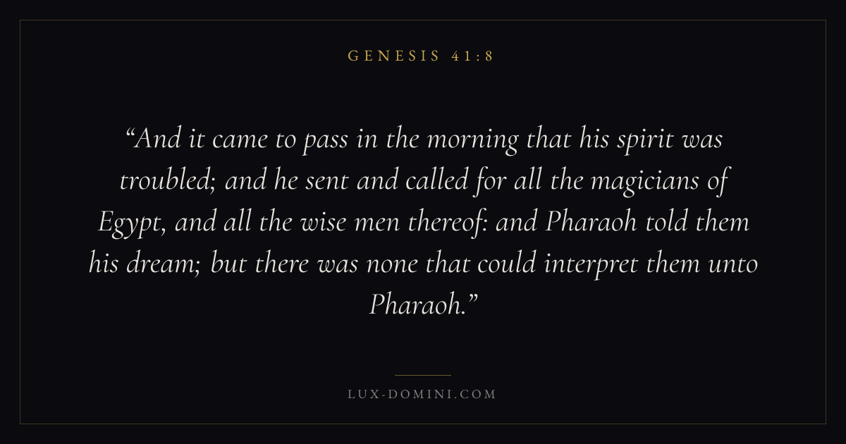 And it came to pass in the morning that his spirit was troubled; and he sent and called for all the magicians of Egypt, and all the wise men thereof: and Pharaoh told them his dream; but there was none that could interpret them unto Pharaoh.