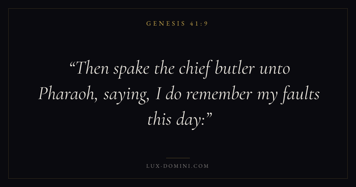 Books / Genesis / Chapter 41 / Verse 9 ← Genesis 41:8 Genesis 41:9 Genesis 41:10 → Then spake the chief butler unto Pharaoh, saying, I do remember my faults this day: Download verse card Share on Twitter Share on Facebook Pin it ✦ Key themes HopeCreationFallCovenant Read with Genesis 41:10Genesis 41:11Romans 8:24Revelation 21:4 Related topics Bible verses about hope ✦ Genesis Chapter 41 verses V. 1 V. 2 V. 3 V. 4 V. 5 V. 6 V. 7 V. 8 V. 9 V. 10 V. 11 V. 12 V. 13 V. 14 V. 15 V. 16 V. 17 V. 18 V. 19 V. 20 V. 21 V. 22 V. 23 V. 24 V. 25 V. 26 V. 27 V. 28 V. 29 V. 30 V. 31 V. 32 V. 33 V. 34 V. 35 V. 36 V. 37 V. 38 V. 39 V. 40 V. 41 V. 42 V. 43 V. 44 V. 45 V. 46 V. 47 V. 48 V. 49 V. 50 V. 51 V. 52 V. 53 V. 54 V. 55 V. 56 V. 57