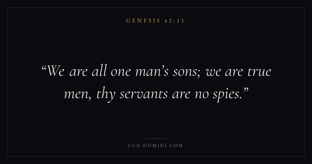 Books / Genesis / Chapter 42 / Verse 11 ← Genesis 42:10 Genesis 42:11 Genesis 42:12 → We are all one man’s sons; we are true men, thy servants are no spies. Download verse card Share on Twitter Share on Facebook Pin it ✦ Key themes HopeTruthCreationFall Read with Genesis 42:12Genesis 42:13Romans 8:24Revelation 21:4 Related topics Bible verses about hopeBible verses about truth ✦ Genesis Chapter 42 verses V. 1 V. 2 V. 3 V. 4 V. 5 V. 6 V. 7 V. 8 V. 9 V. 10 V. 11 V. 12 V. 13 V. 14 V. 15 V. 16 V. 17 V. 18 V. 19 V. 20 V. 21 V. 22 V. 23 V. 24 V. 25 V. 26 V. 27 V. 28 V. 29 V. 30 V. 31 V. 32 V. 33 V. 34 V. 35 V. 36 V. 37 V. 38
