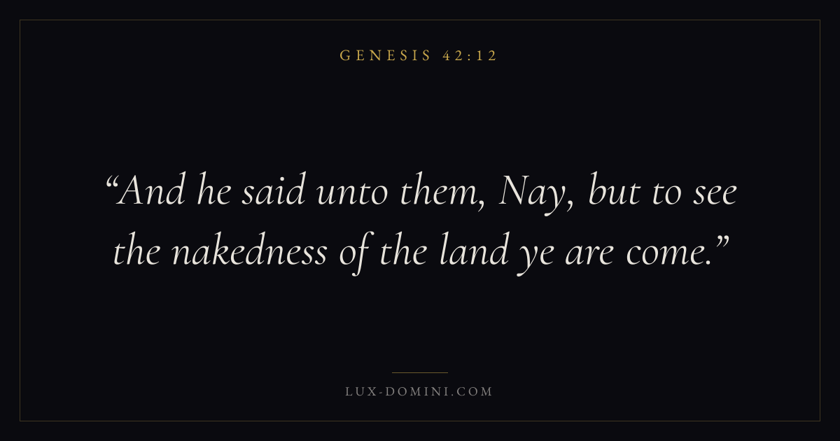 Books / Genesis / Chapter 42 / Verse 12 ← Genesis 42:11 Genesis 42:12 Genesis 42:13 → And he said unto them, Nay, but to see the nakedness of the land ye are come. Download verse card Share on Twitter Share on Facebook Pin it ✦ Key themes HopeCreationFallCovenant Read with Genesis 42:11Genesis 42:13Romans 8:24Revelation 21:4 Related topics Bible verses about hope ✦ Genesis Chapter 42 verses V. 1 V. 2 V. 3 V. 4 V. 5 V. 6 V. 7 V. 8 V. 9 V. 10 V. 11 V. 12 V. 13 V. 14 V. 15 V. 16 V. 17 V. 18 V. 19 V. 20 V. 21 V. 22 V. 23 V. 24 V. 25 V. 26 V. 27 V. 28 V. 29 V. 30 V. 31 V. 32 V. 33 V. 34 V. 35 V. 36 V. 37 V. 38
