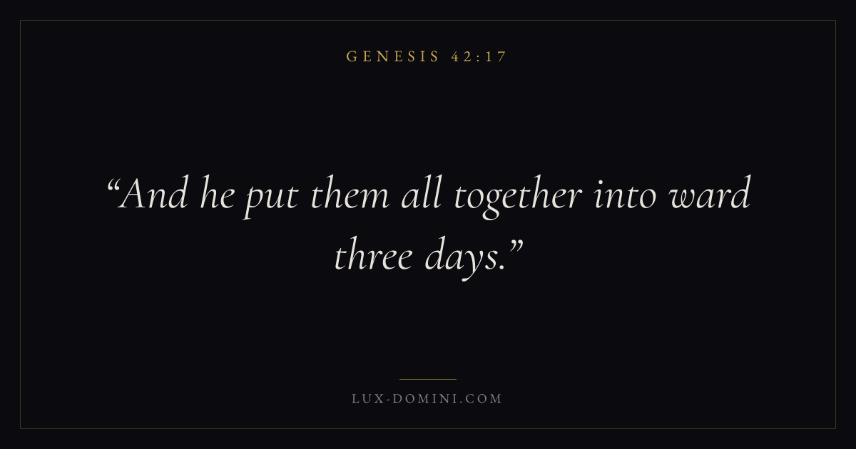 Books / Genesis / Chapter 42 / Verse 17 ← Genesis 42:16 Genesis 42:17 Genesis 42:18 → And he put them all together into ward three days. Download verse card Share on Twitter Share on Facebook Pin it ✦ Key themes HopeCreationFallCovenant Read with Genesis 42:16Genesis 42:18Romans 8:24Revelation 21:4 Related topics Bible verses about hope ✦ Genesis Chapter 42 verses V. 1 V. 2 V. 3 V. 4 V. 5 V. 6 V. 7 V. 8 V. 9 V. 10 V. 11 V. 12 V. 13 V. 14 V. 15 V. 16 V. 17 V. 18 V. 19 V. 20 V. 21 V. 22 V. 23 V. 24 V. 25 V. 26 V. 27 V. 28 V. 29 V. 30 V. 31 V. 32 V. 33 V. 34 V. 35 V. 36 V. 37 V. 38