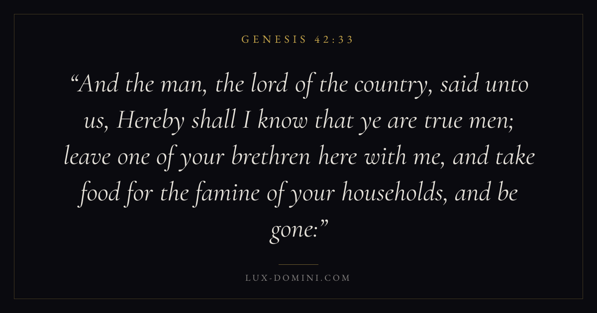 And the man, the lord of the country, said unto us, Hereby shall I know that ye are true men; leave one of your brethren here with me, and take food for the famine of your households, and be gone:
