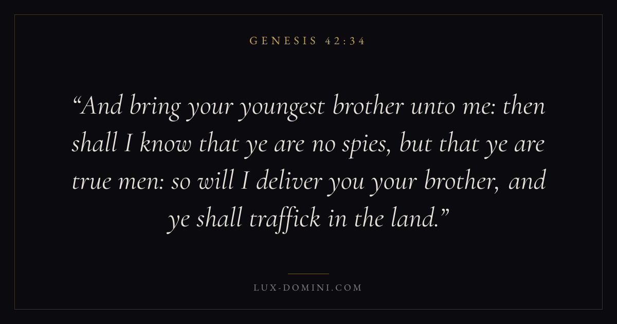 And bring your youngest brother unto me: then shall I know that ye are no spies, but that ye are true men: so will I deliver you your brother, and ye shall traffick in the land.
