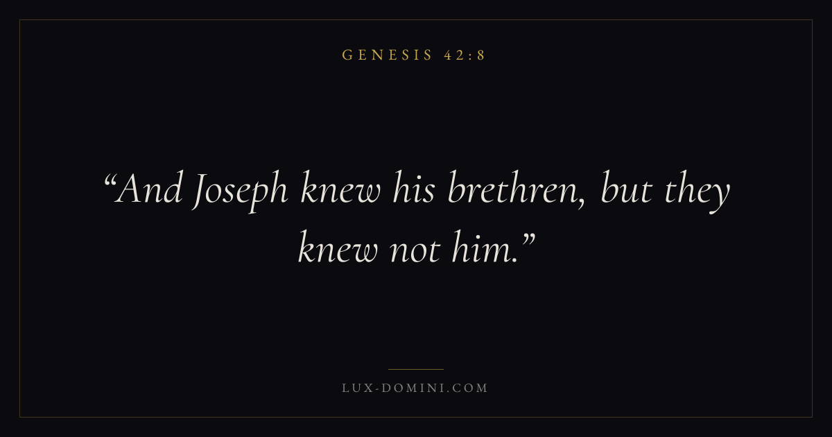 Books / Genesis / Chapter 42 / Verse 8 ← Genesis 42:7 Genesis 42:8 Genesis 42:9 → And Joseph knew his brethren, but they knew not him. Download verse card Share on Twitter Share on Facebook Pin it ✦ Key themes HopeCreationFallCovenant Read with Genesis 42:7Genesis 42:9Romans 8:24Revelation 21:4 Related topics Bible verses about hope ✦ Genesis Chapter 42 verses V. 1 V. 2 V. 3 V. 4 V. 5 V. 6 V. 7 V. 8 V. 9 V. 10 V. 11 V. 12 V. 13 V. 14 V. 15 V. 16 V. 17 V. 18 V. 19 V. 20 V. 21 V. 22 V. 23 V. 24 V. 25 V. 26 V. 27 V. 28 V. 29 V. 30 V. 31 V. 32 V. 33 V. 34 V. 35 V. 36 V. 37 V. 38