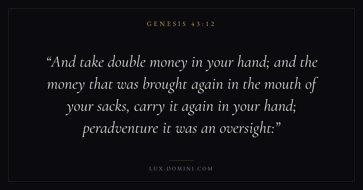 And take double money in your hand; and the money that was brought again in the mouth of your sacks, carry it again in your hand; peradventure it was an oversight: