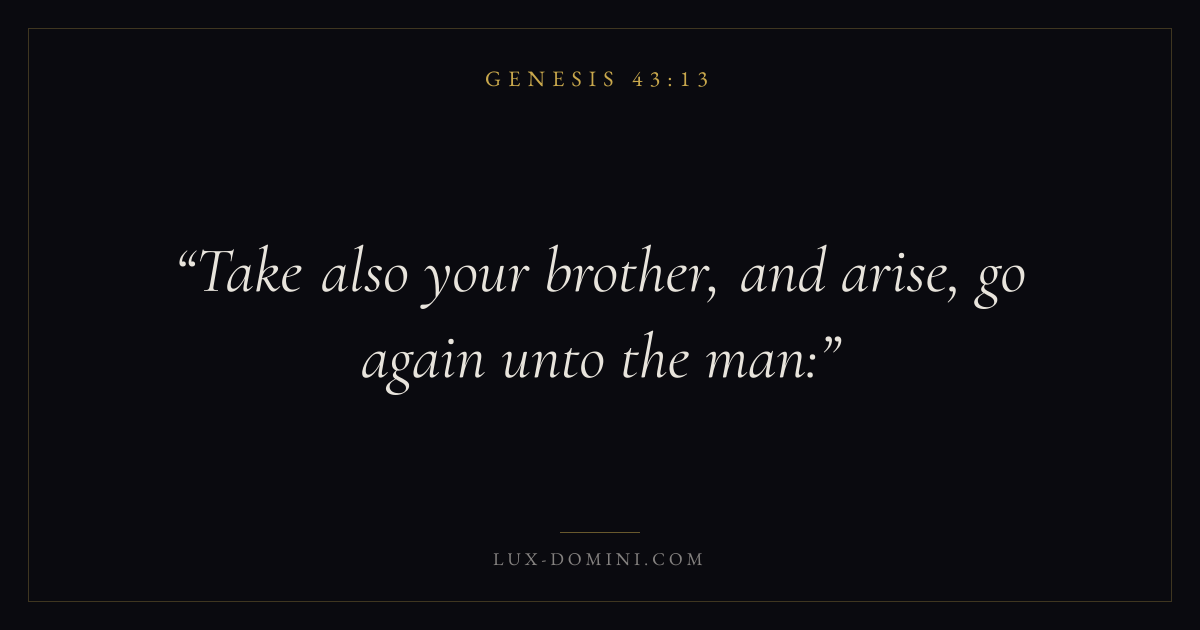 Books / Genesis / Chapter 43 / Verse 13 ← Genesis 43:12 Genesis 43:13 Genesis 43:14 → Take also your brother, and arise, go again unto the man: Download verse card Share on Twitter Share on Facebook Pin it ✦ Key themes HopeCreationFallCovenant Read with Genesis 43:11Genesis 43:12Romans 8:24Revelation 21:4 Related topics Bible verses about hope ✦ Genesis Chapter 43 verses V. 1 V. 2 V. 3 V. 4 V. 5 V. 6 V. 7 V. 8 V. 9 V. 10 V. 11 V. 12 V. 13 V. 14 V. 15 V. 16 V. 17 V. 18 V. 19 V. 20 V. 21 V. 22 V. 23 V. 24 V. 25 V. 26 V. 27 V. 28 V. 29 V. 30 V. 31 V. 32 V. 33 V. 34