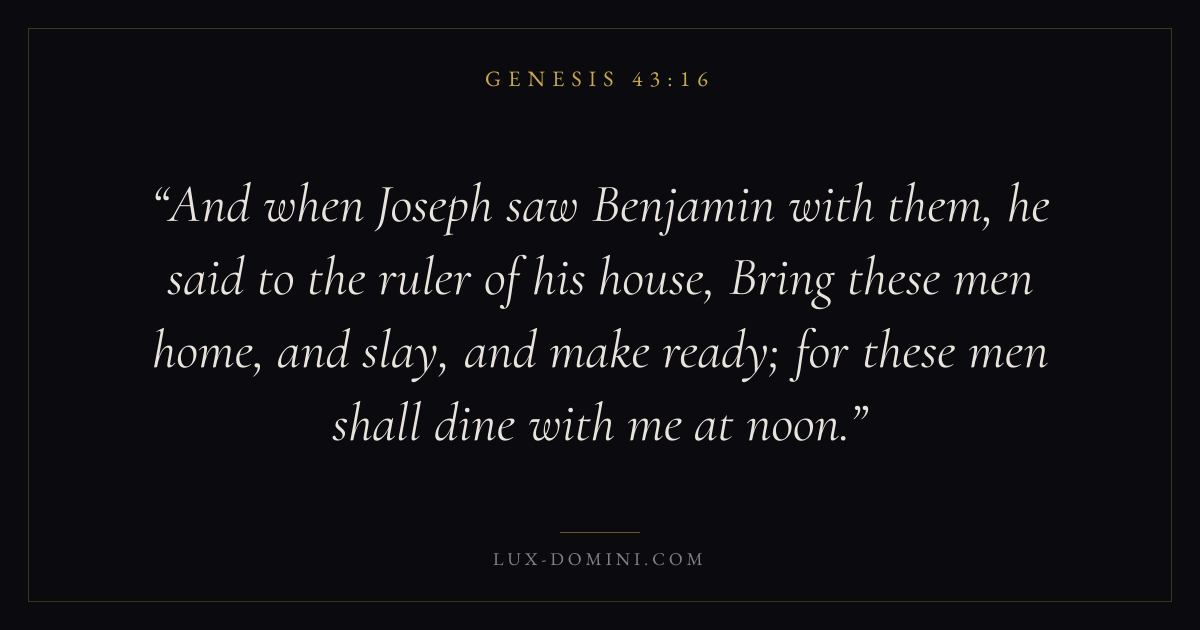And when Joseph saw Benjamin with them, he said to the ruler of his house, Bring these men home, and slay, and make ready; for these men shall dine with me at noon.