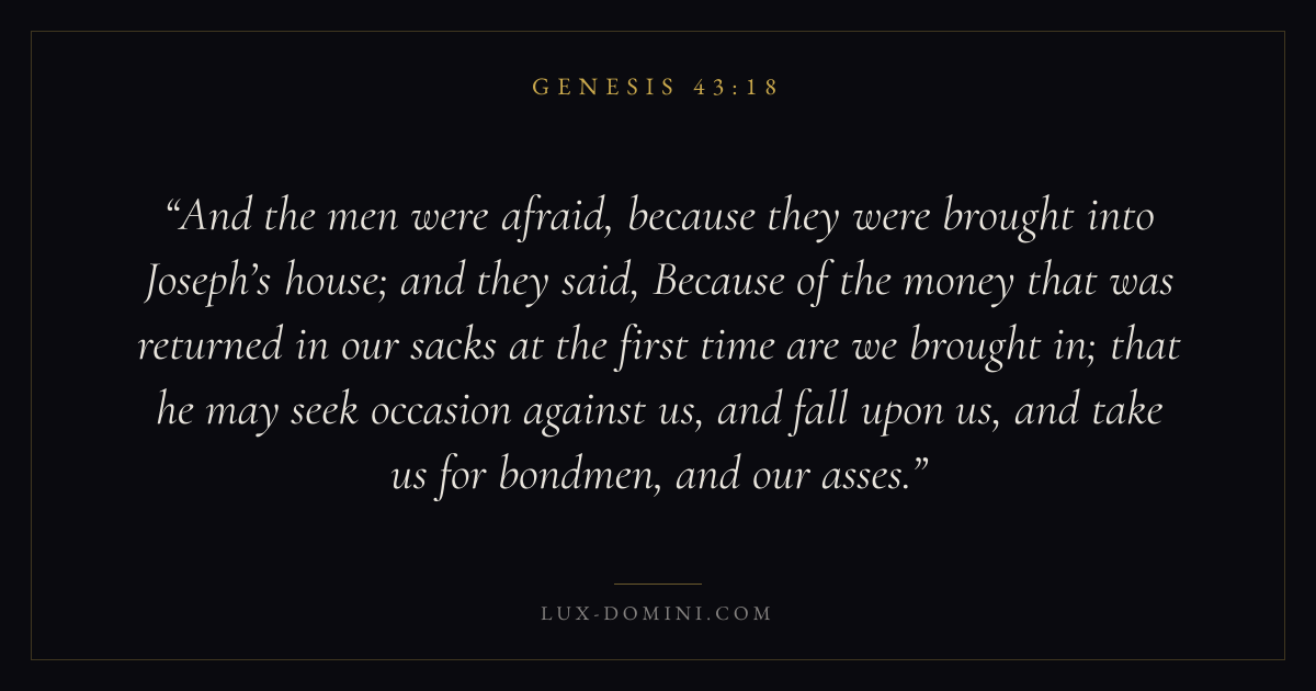 And the men were afraid, because they were brought into Joseph’s house; and they said, Because of the money that was returned in our sacks at the first time are we brought in; that he may seek occasion against us, and fall upon us, and take us for bondmen, and our asses.
