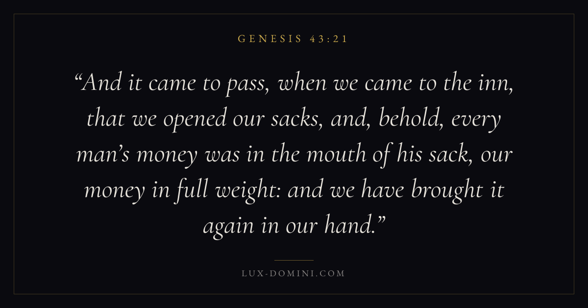 And it came to pass, when we came to the inn, that we opened our sacks, and, behold, every man’s money was in the mouth of his sack, our money in full weight: and we have brought it again in our hand.