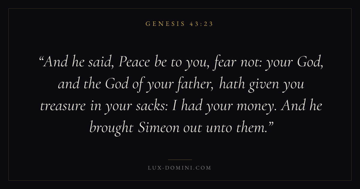 And he said, Peace be to you, fear not: your God, and the God of your father, hath given you treasure in your sacks: I had your money. And he brought Simeon out unto them.