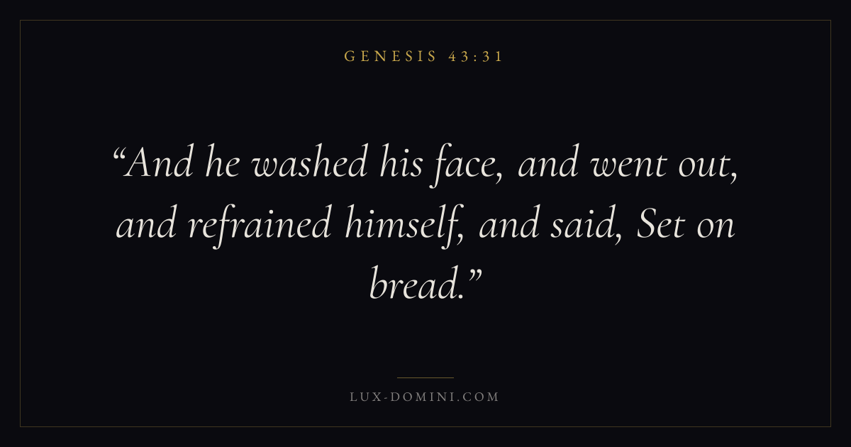 Books / Genesis / Chapter 43 / Verse 31 ← Genesis 43:30 Genesis 43:31 Genesis 43:32 → And he washed his face, and went out, and refrained himself, and said, Set on bread. Download verse card Share on Twitter Share on Facebook Pin it ✦ Key themes HopeCreationFallCovenant Read with Genesis 43:32Genesis 43:33Romans 8:24Revelation 21:4 Related topics Bible verses about hope ✦ Genesis Chapter 43 verses V. 1 V. 2 V. 3 V. 4 V. 5 V. 6 V. 7 V. 8 V. 9 V. 10 V. 11 V. 12 V. 13 V. 14 V. 15 V. 16 V. 17 V. 18 V. 19 V. 20 V. 21 V. 22 V. 23 V. 24 V. 25 V. 26 V. 27 V. 28 V. 29 V. 30 V. 31 V. 32 V. 33 V. 34