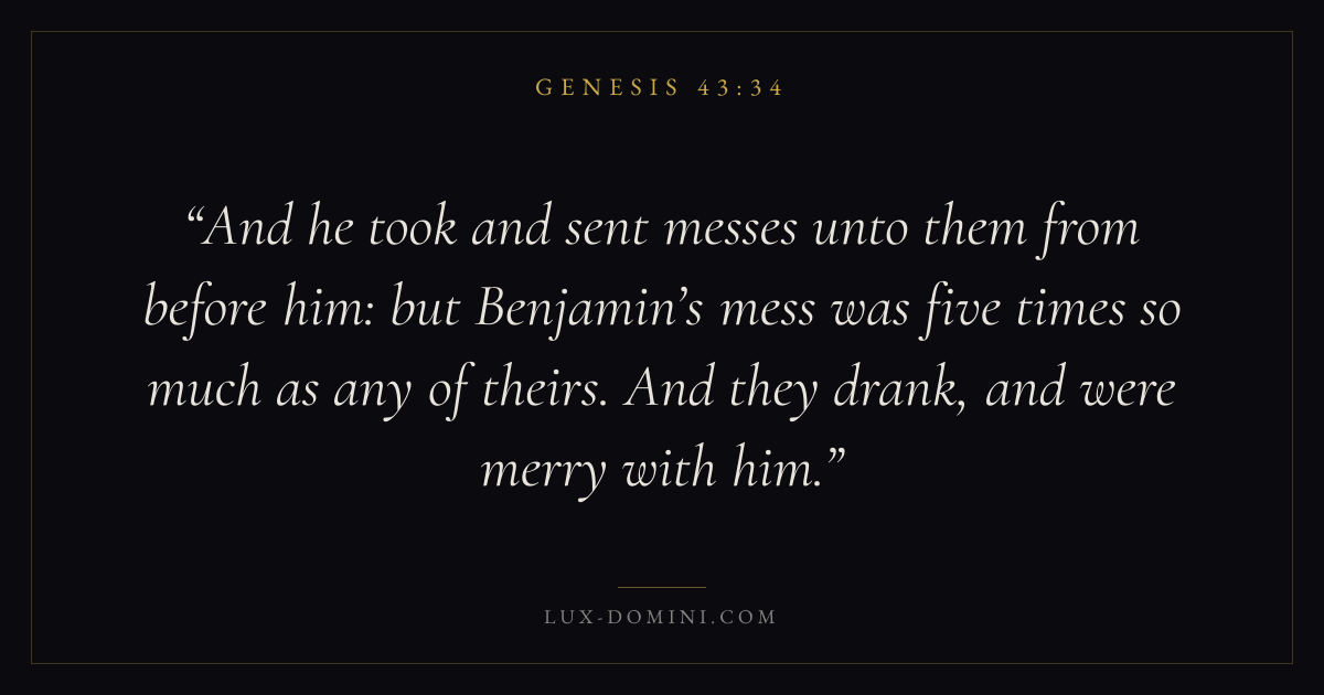 And he took and sent messes unto them from before him: but Benjamin’s mess was five times so much as any of theirs. And they drank, and were merry with him.