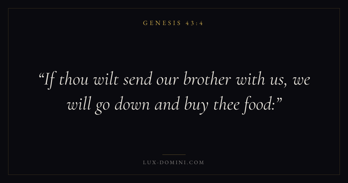 Books / Genesis / Chapter 43 / Verse 4 ← Genesis 43:3 Genesis 43:4 Genesis 43:5 → If thou wilt send our brother with us, we will go down and buy thee food: Download verse card Share on Twitter Share on Facebook Pin it ✦ Key themes HopeCreationFallCovenant Read with Genesis 43:5Genesis 43:6Romans 8:24Revelation 21:4 Related topics Bible verses about hope ✦ Genesis Chapter 43 verses V. 1 V. 2 V. 3 V. 4 V. 5 V. 6 V. 7 V. 8 V. 9 V. 10 V. 11 V. 12 V. 13 V. 14 V. 15 V. 16 V. 17 V. 18 V. 19 V. 20 V. 21 V. 22 V. 23 V. 24 V. 25 V. 26 V. 27 V. 28 V. 29 V. 30 V. 31 V. 32 V. 33 V. 34
