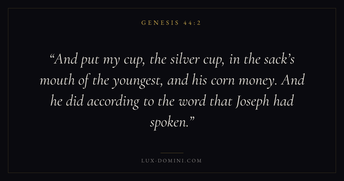 And put my cup, the silver cup, in the sack’s mouth of the youngest, and his corn money. And he did according to the word that Joseph had spoken.