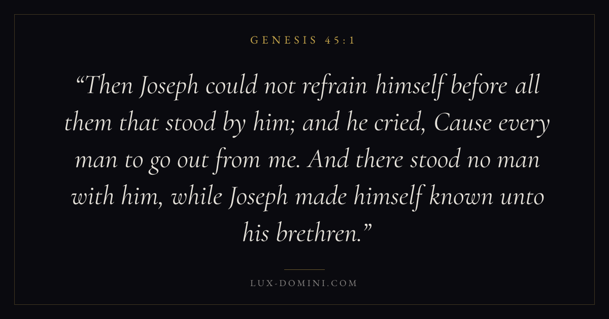 Then Joseph could not refrain himself before all them that stood by him; and he cried, Cause every man to go out from me. And there stood no man with him, while Joseph made himself known unto his brethren.
